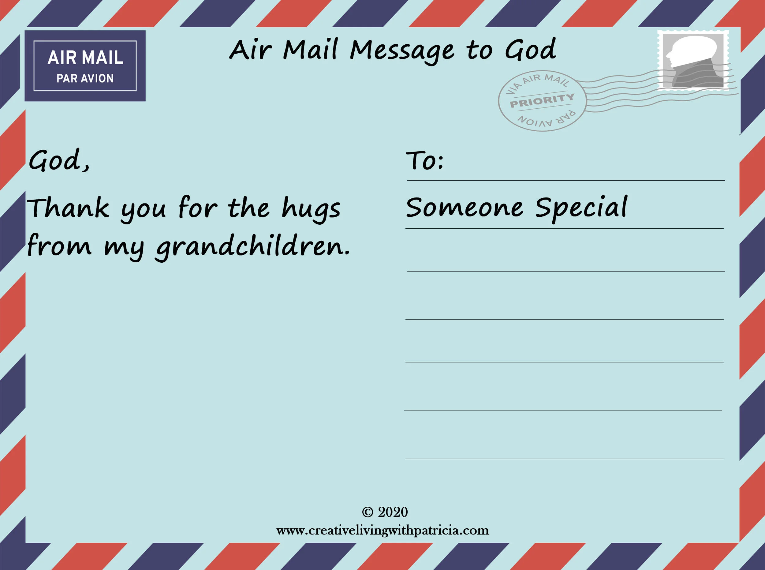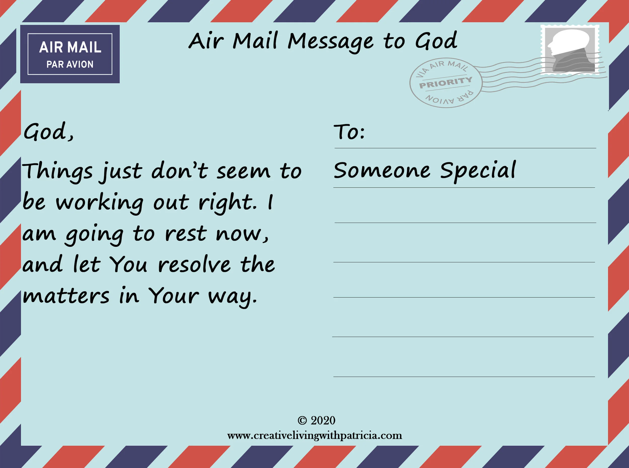 The inspiration for the AIR MAIL MESSAGES TO GOD cards came to my consciousness on a day that I was feeling out of sorts. I wrote down a few of the things that were troubling me, and thought about making a God Box for my innermost thoughts. It was my way of releasing the problems to the Let Go and Let God realm. Instead, I taped the little scraps of paper to the yellow tiles on my bathroom wall.